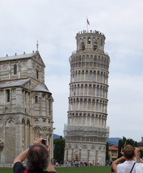 Es ist noch früh am Tag, daher beschließen wir, dass wir das erste große Ziel der Reise besichtigen wollen und machen uns auf in das 10 km entfernte Pisa um den schiefen Turm zu suchen. Nach einer kleinen Irrfahrt durch die Stadt frage ich eine Einheimische nach dem Weg und das klappt auf Englisch doch ganz gut. Wir finden einen Touristenparkplatz und machen uns auf den Weg in das Touristengetümmel, immer den Menschenmassen nach. Der Turm sieht in Natura viel schiefer aus, als er auf den Fotos zur Geltung kommt. Wir sehen immer wieder Touristen, die jemanden fotografieren, der den Turm zu stützen (oder auch umzuwerfen) scheint. Detaillierte Informationen über den Turm findet man bei Wikipedia.
